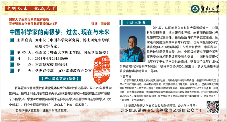 百年暨南文化素質教育講堂第344期:中國科學家的南極夢:過去丶現在與未來