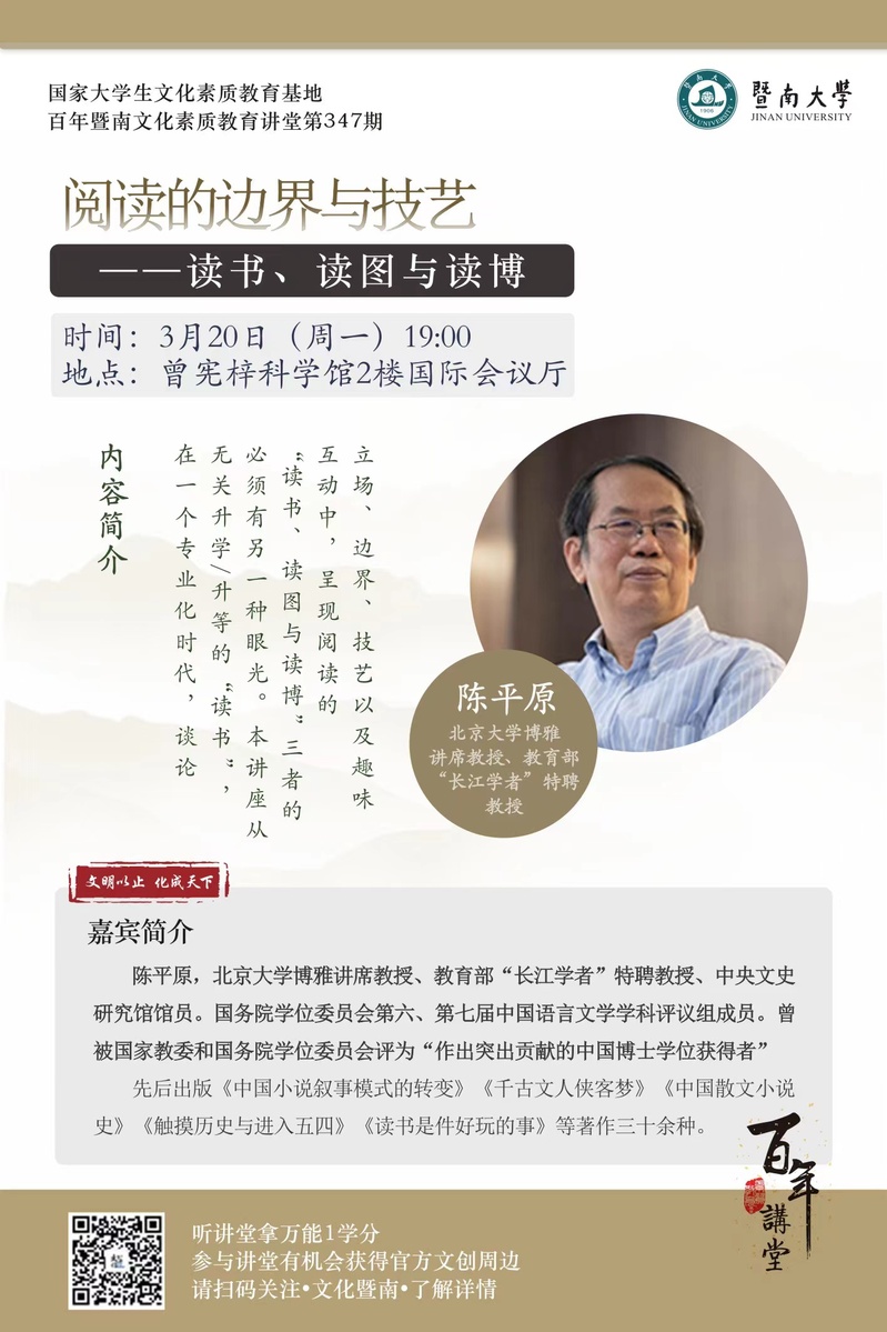 百年暨南文化素質教育講堂第347期:陳平原:閱讀的邊界與技藝讀書、讀圖與讀博