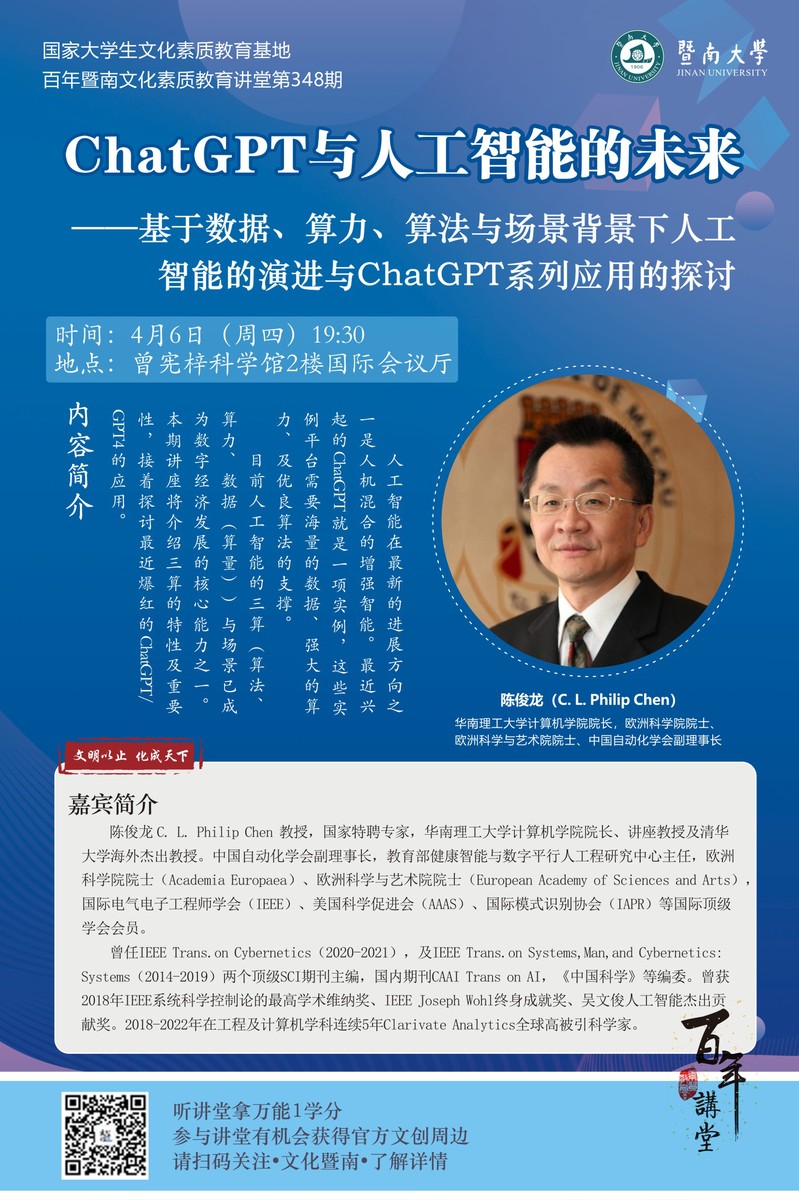 百年暨南文化素質(zhì)教育講堂第348期:陳俊龍:ChatGPT與人工智能的未來 ——基于數(shù)據(jù)、算力、算法與場景背景下人工智能的演進與ChatGPT系列應(yīng)用的探討