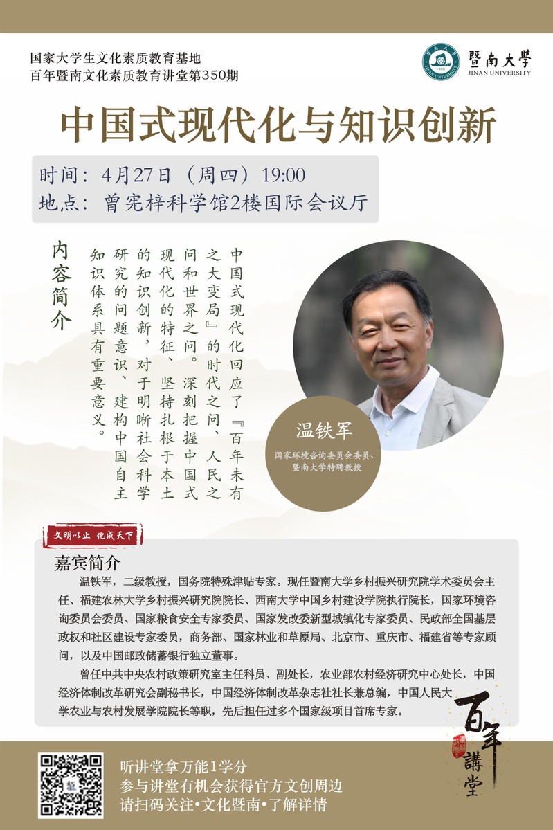百年暨南文化素質教育講堂第350期:溫鐵軍:中國式現代化與知識創新