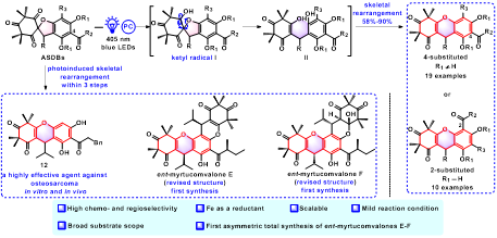 暨南大學融媒體中心訊 高度官能團化的氧雜蒽類化合物具有顯著的生物活性。然而,由于其復雜的環系結構、多手性中心及高氧化態,合成該類化合物面臨諸多挑戰。暨南大學葉文才/王磊/程民井團隊前期發展了光延反應介導的手性拆分方法,實現了多種氧雜蒽類天然產物的首次不對稱全合成(Nat. Commun.2024, 15, 5879)。近期,為了避免依賴手性拆分方法,作者在分離鑒定的螺環天然產物myrtuspirone A的化學結構啟發下(Org. Lett.2019, 21, 1583),提出了一種基于螺環底物的光催化骨架重排策略,成功應用于myrtucomvalones E-F的首次不對稱全合成,并與劉暢副研究員合作發現了具有顯著抗骨肉瘤活性的化合物。相關研究成果發表于Angew Chem In Ed(DOI:10.1002/anie.202420671),暨南大學博士研究生林詩琳、碩士研究生趙芬和魏芬為共同第一作者。