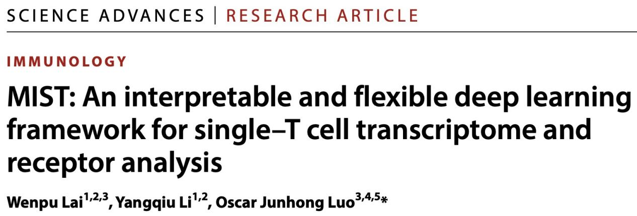 暨南大學融媒體中心訊 近日,暨南大學基礎醫學與公共衛生學院羅鈞洪團隊在Science子刊Science Advances發表題為“MIST:an interpretable and flexible deep learning framework for single-T cell transcriptome and receptor analysis”的研究成果。該研究基于變分自編碼器(Variational Autoencoder)深度學習框架開發了人工智能模型MIST(Multi-Insight for T cell),針對scRNA-seq與scTCR-seq數據的聯合分析,創新性地構建了跨組學數據深度融合、可解釋性和適配性強的分析框架。該模型通過獨立的轉錄組、TCR序列和聯合潛變量空間三層嵌入,精準解析了T細胞的功能狀態、克隆擴增模式及抗原特異性,克服現有方法在組學數據整合和生物學可解釋性方面的局限,為深入解析免疫系統提供了強大工具。