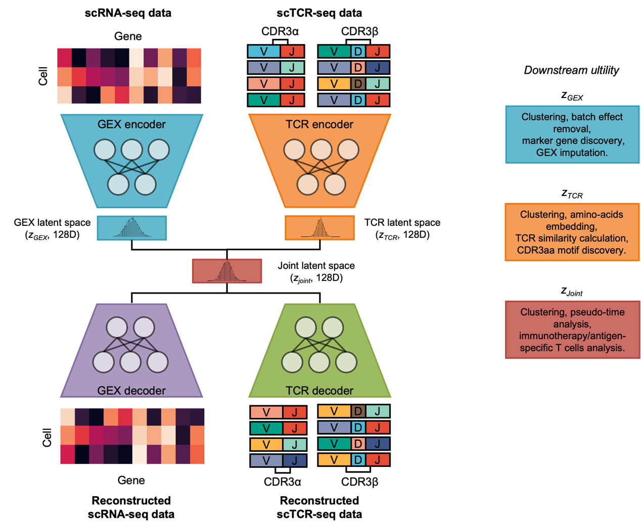 T細胞在腫瘤免疫、感染免疫及自身免疫性疾病等多種生理和病理過程中發揮重要作用,但其功能狀態、轉錄特征及TCR解析仍面臨挑戰。MIST通過深度學習結合生物學先驗知識,精準解析TCR與T細胞轉錄特征,并可用于挖掘T細胞的功能狀態、亞群特征及免疫反應模式。該模型具備跨組學整合(單細胞轉錄組和免疫組庫)、可解釋性強(自然語言處理和自注意力機制)、使用簡便靈活等特點。