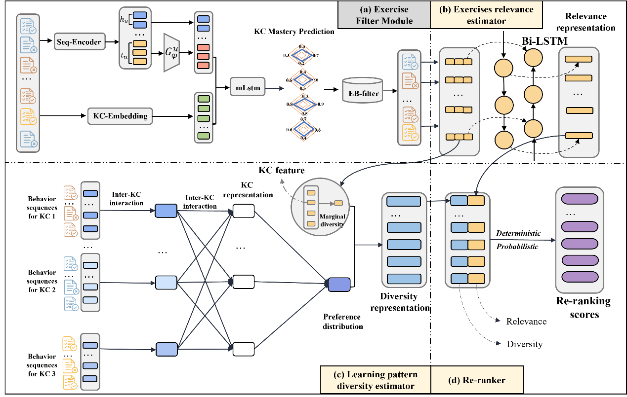 成果簡介:隨著在線教育平臺的廣泛普及,越來越多的學(xué)生通過大規(guī)模開放在線課程(MOOCs)獲取新知識,習(xí)題推薦算法也在提升學(xué)生在線學(xué)習(xí)效果方面取得了重要進(jìn)展。然而,在線教育仍面臨高輟學(xué)率及有效適應(yīng)學(xué)生多樣化需求的挑戰(zhàn)。現(xiàn)有方法往往難以適配不積極學(xué)生的學(xué)習(xí)模式并滿足其個性化需求,導(dǎo)致推薦結(jié)果的準(zhǔn)確性與多樣性不足。為此,我們提出NR4DER:一種基于神經(jīng)重排序的多樣化習(xí)題推薦方法。該方法通過序列增強(qiáng)的方式強(qiáng)化不積極學(xué)生的表征,生成適合學(xué)生難度的習(xí)題候選列表,并基于該列表運(yùn)用神經(jīng)重排序技術(shù)生成多樣化推薦列表。實(shí)驗(yàn)結(jié)果表明,NR4DER在多個真實(shí)世界數(shù)據(jù)集上不僅顯著優(yōu)于現(xiàn)有方法,還能有效滿足學(xué)生多樣化學(xué)習(xí)需求。