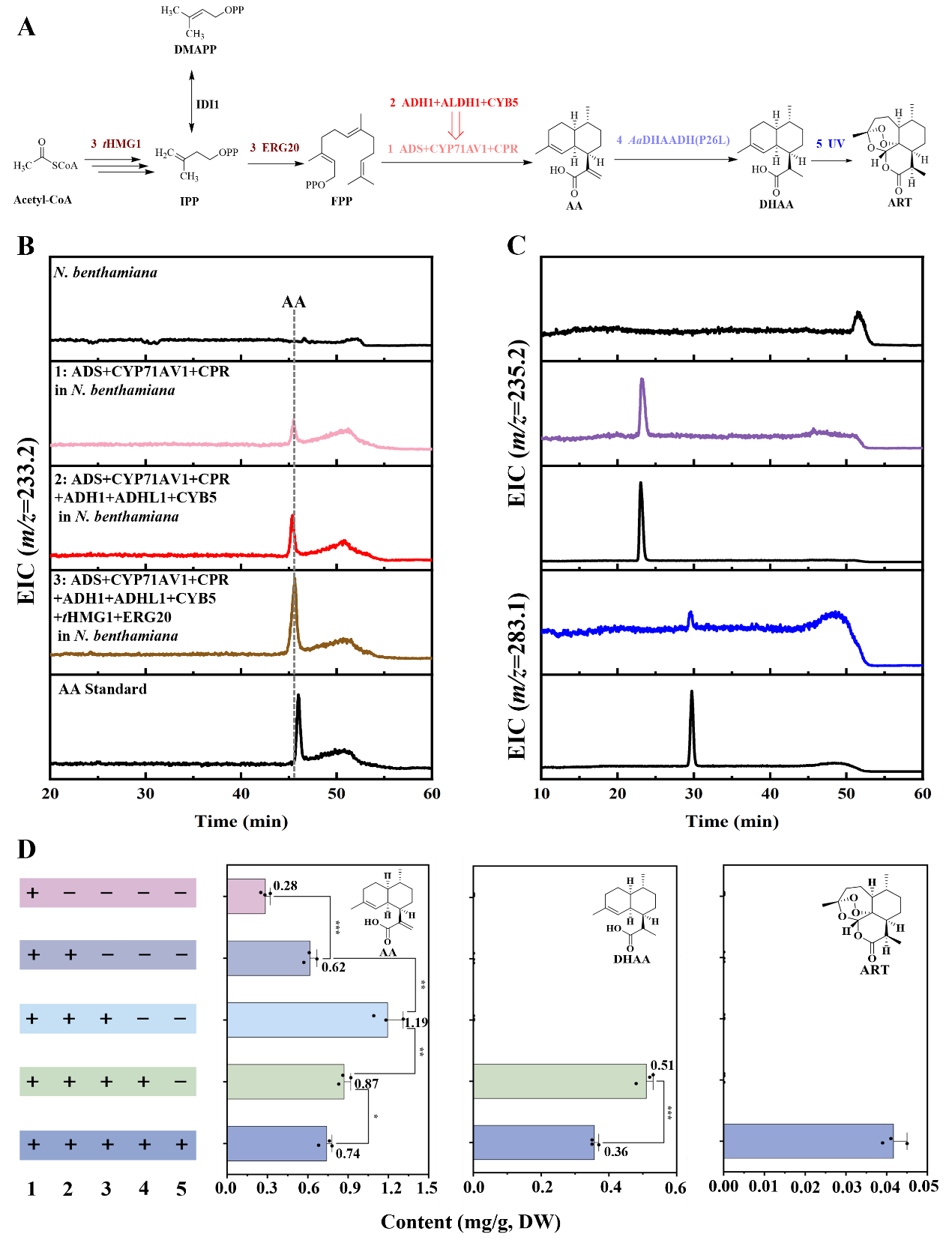 A:在本氏煙草中ART的生物合成線路圖;B:在本氏煙草中瞬時(shí)表達(dá)關(guān)鍵酶生產(chǎn)AA的LC-MS檢測(cè)(m/z=233.2);C:在本氏煙草中瞬時(shí)表達(dá)關(guān)鍵酶生產(chǎn)DHAA(m/z=235.2)和ART(m/z=283.1)的LC-MS檢測(cè);D:不同基因組合侵染處理的煙草葉片中產(chǎn)物AA、DHAA和ART的含量。